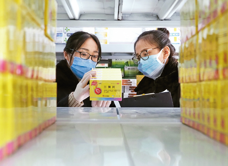 在新冠肺炎疫情防控过程中,山东省各地加大对口罩、消毒水、抗病毒类药品等医药用品的市场监管,严厉打击疫情期间哄抬物价、制假售假等违法行为。图为2020年2月6日,山东无棣县市场监督管理局执法人员在一家连锁药店对药品进行监督抽检。 新华社发 陈子庆/摄