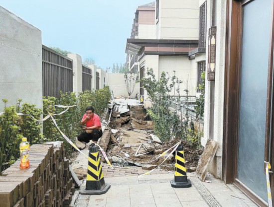 小区地库也出现了大范围渗漏。此外,小区里的道路还在这次大雨中塌陷了。李先生带记者来到居民楼门口,只见塌陷处是一米来深的狭长大坑,湿漉漉的泥土裹挟砖石裸露在深坑中,施工人员将这里围了起来,正在填平道路。“这里是进出居民楼的唯一通道,幸好塌陷时无人经过。”
