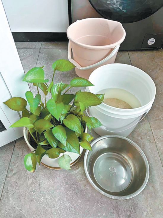 8月3日记者来到国誉府小区。李先生家在顶层,是复式结构,上下两层的阳台都有大面积洇湿的痕迹,有的墙壁上还挂着水珠。阳台上放着大大小小的水桶,桶里全是雨水。“从去年11月收房,到现在还不到一年,已经漏了4次。”
