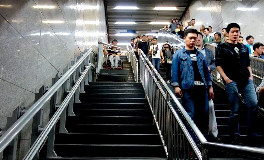 2012年端午节那天早上,北京地铁4号线马家堡站,一位年轻的肢残姑娘,面含微笑,坐轮椅进入楼梯旁的轨道式升降台,由地铁工作人员操纵,从一层到二层,非常方便。