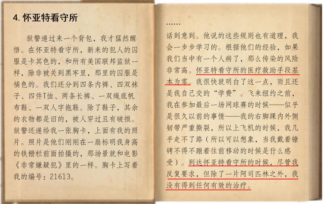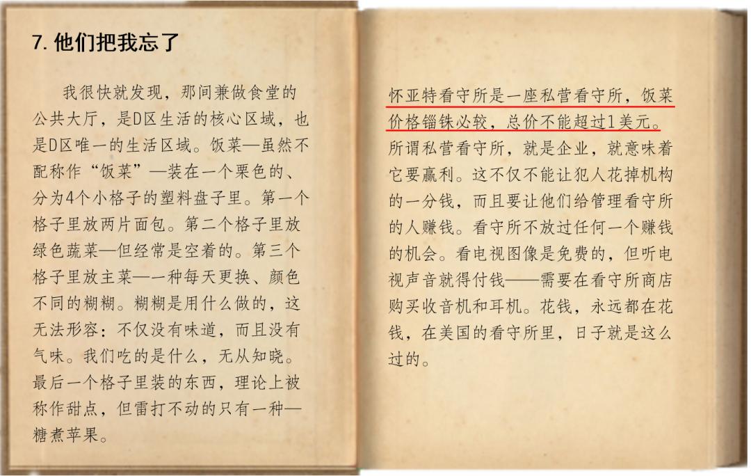 作者皮耶鲁齐在怀亚特看守所里吃的饭菜总价不超过1美元,其中还包含看守所需要从中获取的赢利,脚伤痛难忍也只求得了一片阿司匹林。