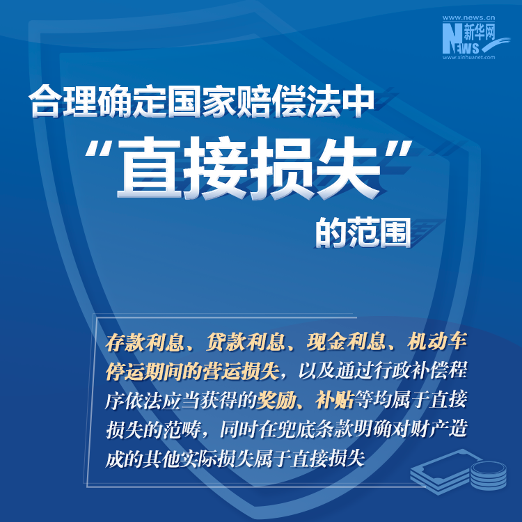 ——合理确定“直接损失”的范围。国家赔偿法规定,行政赔偿仅赔偿侵犯财产权所造成的直接损失。《行政赔偿司法解释》根据行政赔偿案件的自身特点,借鉴民事侵权赔偿的相关规定,通过列举的方式明确了存款利息、贷款利息、现金利息、机动车停运期间的营运损失,以及通过行政补偿程序依法应当获得的奖励、补贴等均属于直接损失的范畴,同时在兜底条款明确对财产造成的其他实际损失属于直接损失,最大限度实现对当事人合法权益的充分保护。