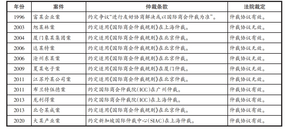 2.境外仲裁机构在中国内地仲裁的有效性问题:约定境外仲裁机构在中国内地仲裁的仲裁条款是否有效从司法实践演进的角度来看,从1996年到2020年的二十多年间,围绕境外仲裁机构在中国内地仲裁的仲裁协议的有效性问题,产生了很多有争议的案件。法院在此类仲裁协议的效力认定上,大致经历了从否定到肯定的转变。下表1具体列举了法院在判断约定境外仲裁机构在内地仲裁的仲裁协议有效性上裁判思路的历史沿革,从相关的司法实践可以清晰地看出,一方面,法院在该问题上存在观点的游离、矛盾和混乱,另一方面,从时间顺利来看,认可此类仲裁协议的效力是目前的时代趋势。