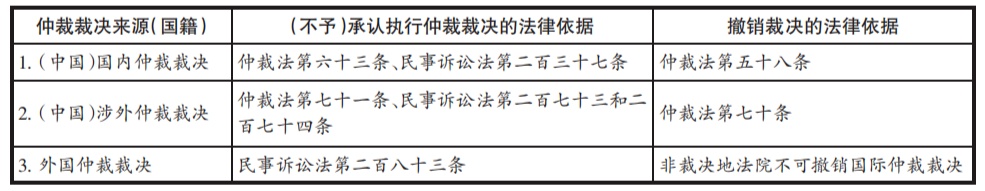 在我国仲裁法律体系下,国内法院对仲裁裁决的执行体制可依据仲裁裁决的来源(或者说仲裁裁决的国籍)分为三类:一是由国内仲裁机构作出的不含任何涉外因素的国内仲裁裁决;二是由国内仲裁机构作出的涉外仲裁裁决;三是由外国仲裁机构作出的外国仲裁裁决。相应地,执行仲裁裁决的路径也有三条,在不同路径下仲裁裁决将会受到不同的司法审查,承认执行裁决的法律依据也有所不同。下表3清晰展现了这样的三元结构。