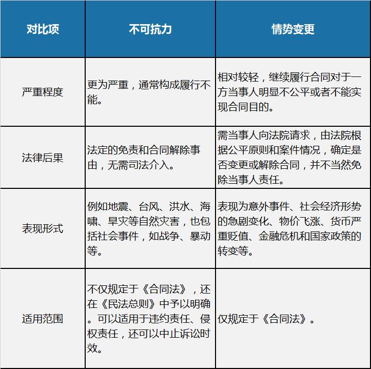 可以看到,尽管不可抗力和情势变更制度均可以用来解除合同,但是此两种制度间仍有着显著的区别。我国法律对于不可抗力的规定,也比情势变更的规定要成熟许多。