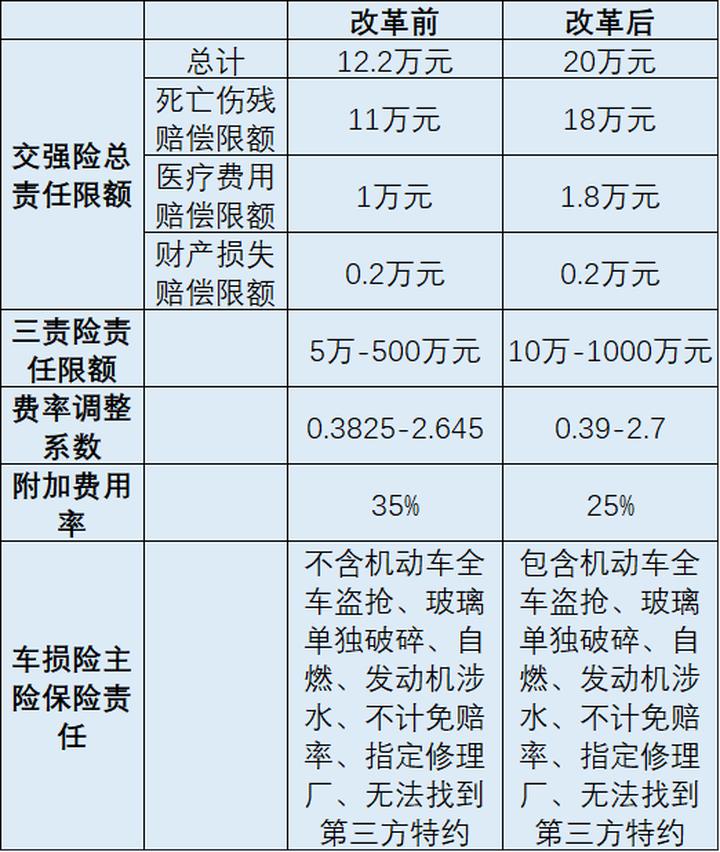 一、将交强险总责任限额从12.2万元提高到20万元,其中死亡伤残赔偿限额从11万元提高到18万元,医疗费用赔偿限额从1万元提高到1.8万元,财产损失赔偿限额维持0.2万元不变。无责任赔偿限额按照相同比例进行调整,其中死亡伤残赔偿限额从1.1万元提高到1.8万元,医疗费用赔偿限额从1000元提高到1800元,财产损失赔偿限额维持100元不变。