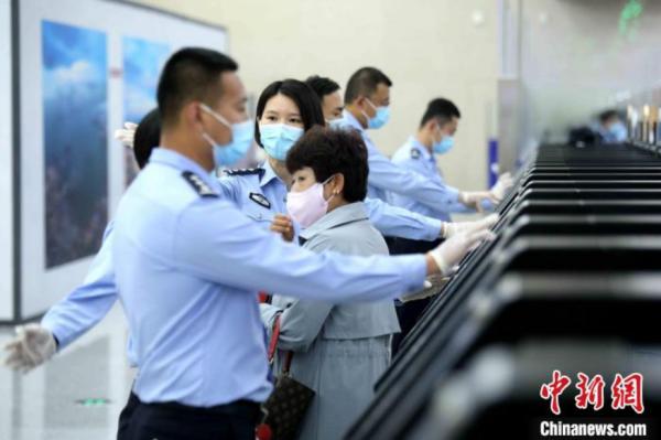 资料图:山东出入境边防检查总站青岛机场边检站民警为入境旅客快捷通关提供操作指引。 解豪 摄