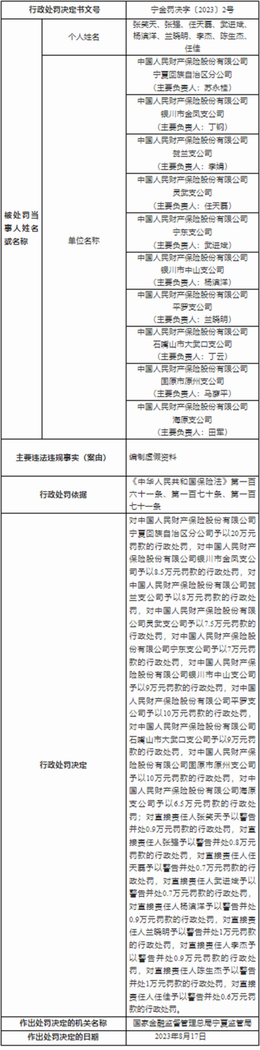 宁夏监管局依据《中华人民共和国保险法》第一百六十一条、第一百七十条、第一百七十一条,对中国人民财产保险股份有限公司宁夏回族自治区分公司予以20万元罚款的行政处罚,对中国人民财产保险股份有限公司银川市金凤支公司予以8.5万元罚款的行政处罚,对中国人民财产保险股份有限公司贺兰支公司予以8万元罚款的行政处罚,对中国人民财产保险股份有限公司灵武支公司予以7.5万元罚款的行政处罚,对中国人民财产保险股份有限公司宁东支公司予以7万元罚款的行政处罚,对中国人民财产保险股份有限公司银川市中山支公司予以9万元罚款的行政处罚,对中国人民财产保险股份有限公司平罗支公司予以10万元罚款的行政处罚,对中国人民财产保险股份有限公司石嘴山市大武口支公司予以9万元罚款的行政处罚,对中国人民财产保险股份有限公司固原市原州支公司予以10万元罚款的行政处罚,对中国人民财产保险股份有限公司海原支公司予以6.5万元罚款的行政处罚;对直接责任人张笑天予以警告并处0.9万元罚款的行政处罚,对直接责任人张强予以警告并处0.8万元罚款的行政处罚,对直接责任人任天磊予以警告并处0.7万元罚款的行政处罚,对直接责任人武进斌予以警告并处0.7万元罚款的行政处罚,对直接责任人杨滨洋予以警告并处0.9万元罚款的行政处罚,对直接责任人兰晓明予以警告并处1万元罚款的行政处罚,对直接责任人李杰予以警告并处0.9万元罚款的行政处罚,对直接责任人陈生杰予以警告并处1万元罚款的行政处罚,对直接责任人任佳予以警告并处0.6万元罚款的行政处罚。