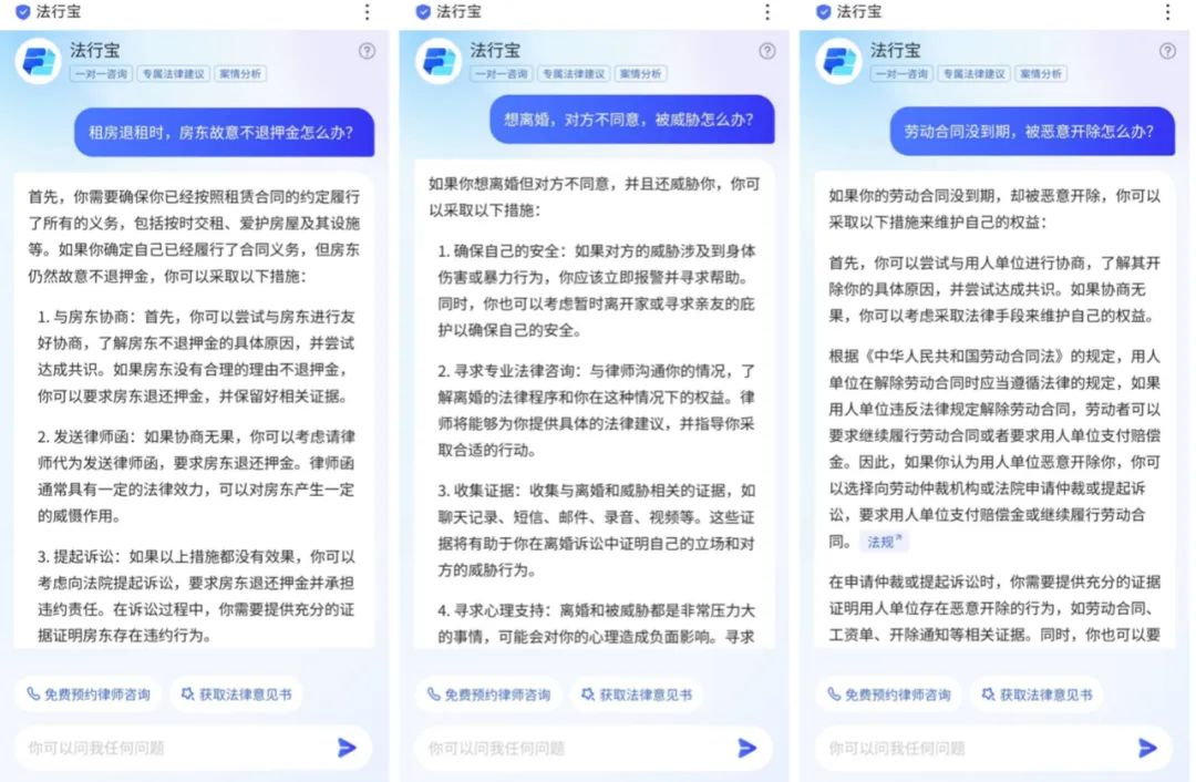 此外,面对用户个性化的法律服务需求,法行宝能够通过深入了解用户的具体需求和情况,提供定制化的法律咨询意见书。“这些意见书不仅考虑到法律条款的适用,还结合了用户的实际情况和利益诉求,为用户提供最为合适的法律建议。”上述技术负责人表示。