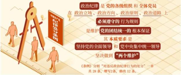 政治纪律是党的各级组织和全体党员在政治立场、政治方向、政治原则、政治道路上必须遵守的行为规则,是维护党的团结统一的根本保证。在党的纪律中,政治纪律是最重要、最根本、最关键的纪律,是打头、管总的纪律,遵守政治纪律和政治规矩是遵守党的全部纪律的前提和基础。
