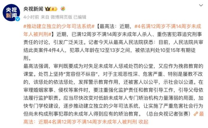 据@央视新闻4月16日消息,近期,已满12周岁不满14周岁未成年人杀人、重伤害犯罪追究刑事责任的讨论,引发广泛关注。记者从最高人民法院获悉:目前,人民法院共审结此类案件4件4人,犯罪人年龄在12至13岁之间,被依法判处10至15年有期徒刑。
