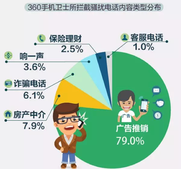 360手机卫士2017年度安全报告,2017年共标记骚扰电话2.42亿个,拦截骚扰电话380.9亿次,骚扰电话数量环比首次有所下降。其中广告推销类骚扰电话占比为79%排在首位,房产中介类占比为7.9%排第二,诈骗电话为6.1%排第三(2016年排第二)。