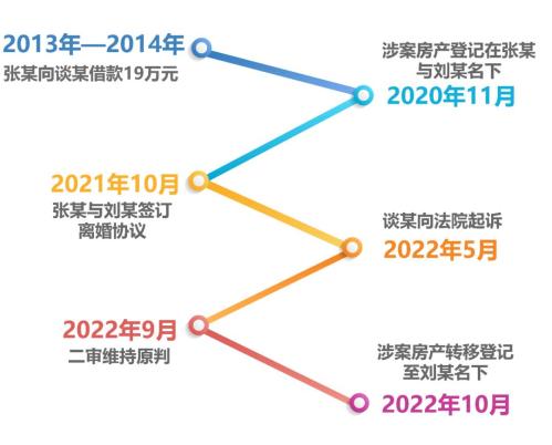 张某与刘某签订离婚协议在借贷诉讼一审前,但房屋转移登记发生在二审判决生效后。张某在对外欠债的情况下,还在离婚协议中约定涉案房产归刘某所有,实质上属于无偿转让财产的行为,已经对债权人造成了损害。故对谈某的诉求,法院予以支持。