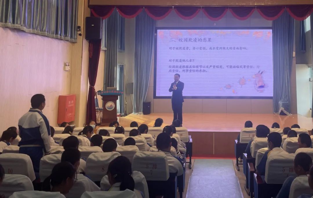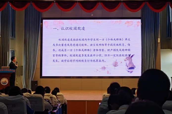 讲座中,干警郭校校以近期热点事件为切入口,通过以案释法、互动问答的形式,将校园欺凌事件所涉违法行为的种类及可能导致的后果,向在场师生进行了讲解。