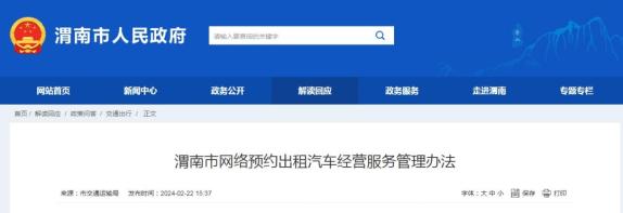 《渭南市网络预约出租汽车经营服务管理办法》已经2023年12月20日市人民政府第20次常务会议审议通过,现予公布,自2024年3月1日起施行。