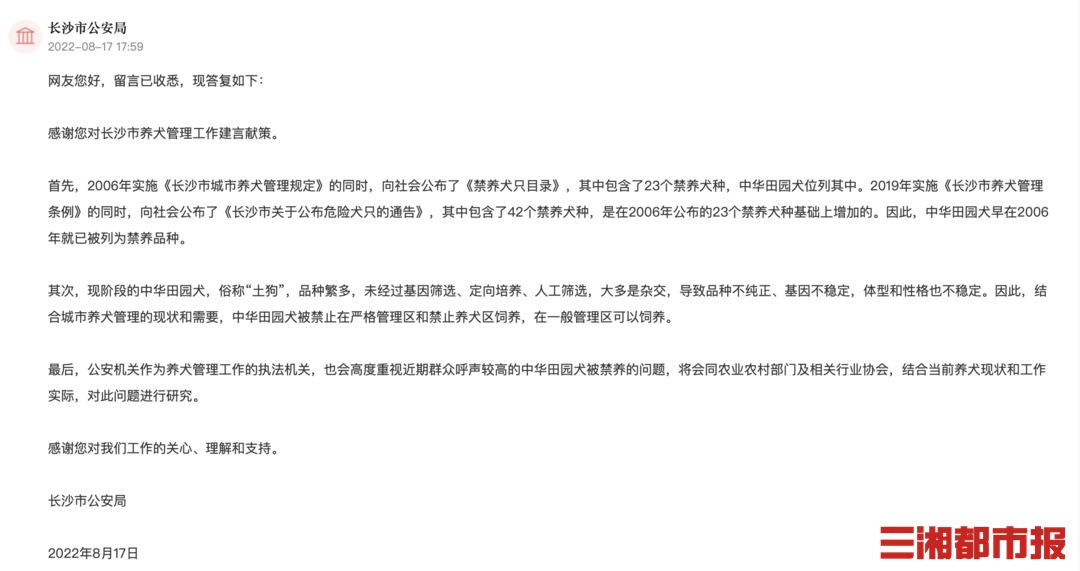 8月17日,长沙市公安局作出回复:2006年实施《长沙市城市养犬管理规定》的同时,向社会公布了《禁养犬只目录》,其中包含了23个禁养犬种,中华田园犬位列其中。2019年实施《长沙市养犬管理条例》的同时,向社会公布了《长沙市关于公布危险犬只的通告》,其中包含了42个禁养犬种,是在2006年公布的23个禁养犬种基础上增加的。因此,中华田园犬早在2006年就已被列为禁养品种。