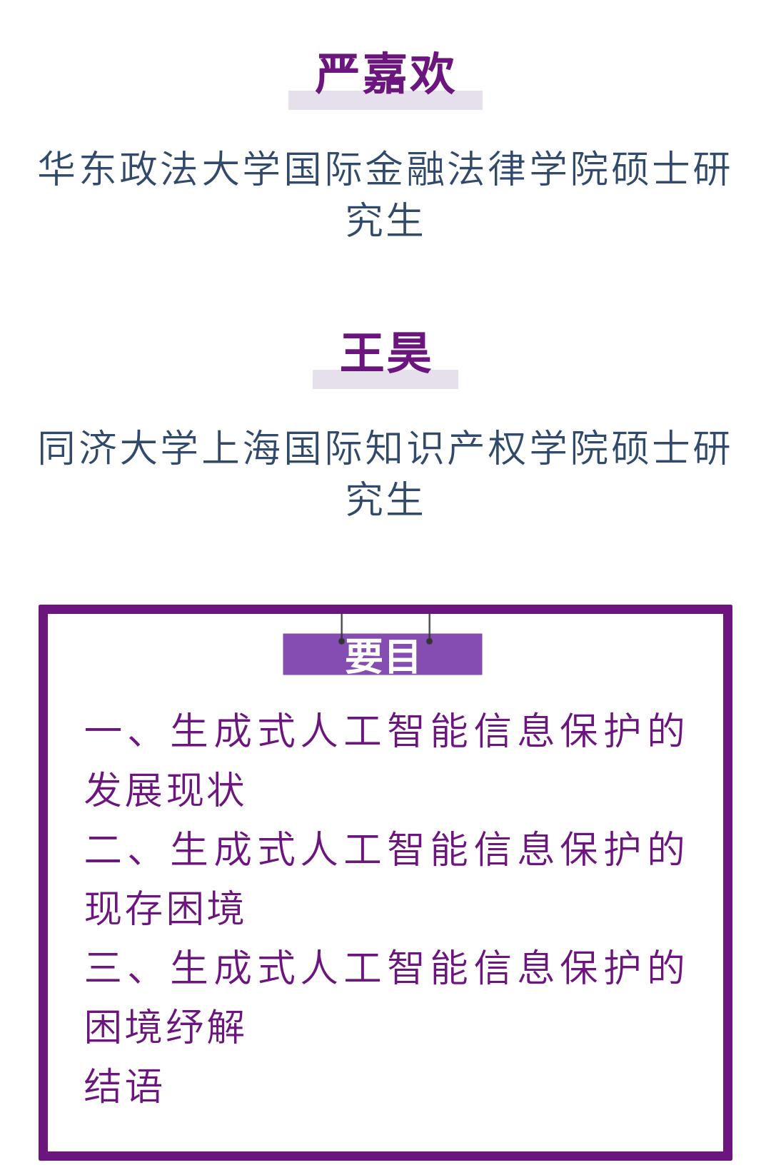 原标题:《严嘉欢 王昊|论生成式人工智能中个人信息保护的困境纾解》