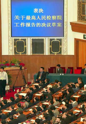 2002 年3 月15 日,九届全国人大五次会议在北京人民大会堂闭幕。图为大会表决关于最高人民检察院工作报告的决议草案。摄影/ 胡海昕