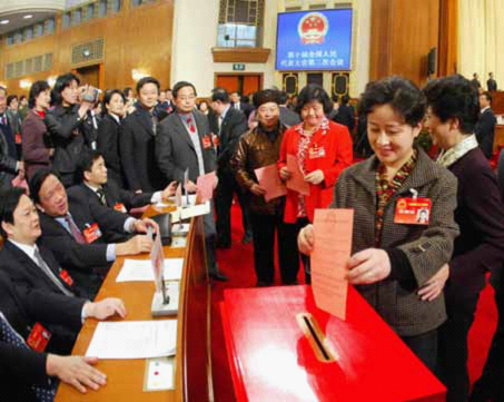 2004 年3 月14 日,出席十届全国人大二次会议的代表们投票表决中华人民共和国宪法修正案草案。2004 年宪法修正案第一次把尊重和保障人权、保护公民合法私有财产、建立健全社会保障制度等写入宪法。摄影/ 刘建生