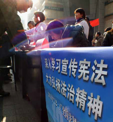 2011 年12 月2 日,湖北宜昌市开展法制宣传活动,“深入学习宣传宪法,大力弘扬法治精神”标语醒目。图/CF