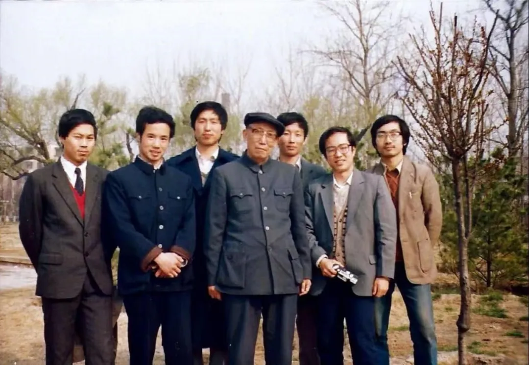 ▲中国人民大学法律系民法教研室青年教师与佟柔郊游合影(从左至右:贾林清、王利明、郑立群、佟柔、楚建、龙翼飞、郭锋,1987年春)