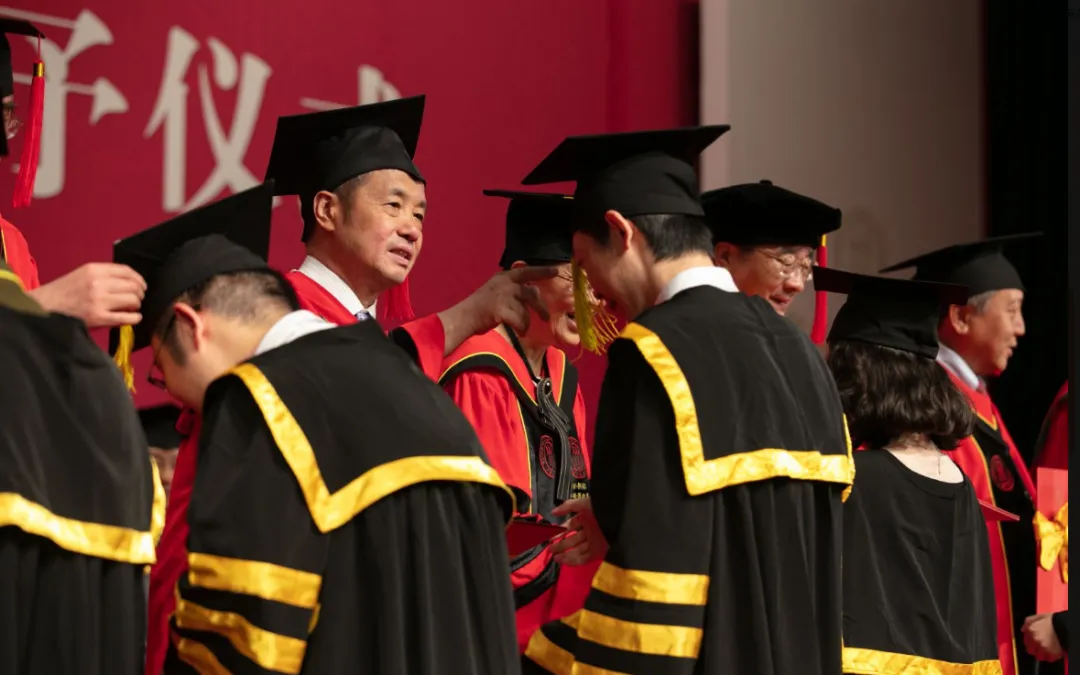 ▲王利明教授在毕业典礼上为毕业生拨穗(2017年)