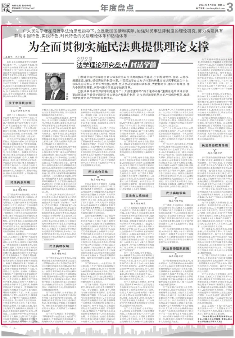 2024年1月3日,《检察日报》刊发王利明教授撰写的《为全面贯彻实施民法典提供理论支撑》一文,文章从民法典体系出发,立足我国国情和实际,针对民法典各编民生所系的相关问题给出了详尽阐释。这篇扎实有力的“年度盘点”,是对过去一年民法典研究阐释如火如荼的高度概括,也为乘势而上、接续奋斗的新一年写下了浓墨重彩的第一笔。