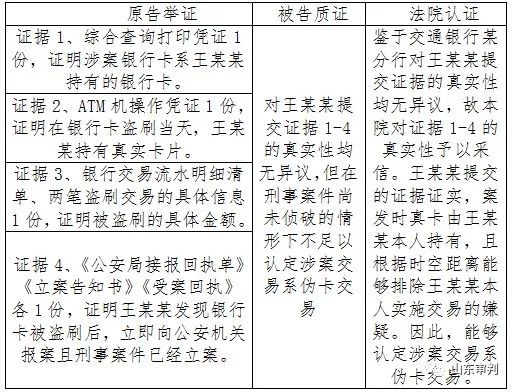 审判实践中,是否存在伪卡交易系处理银行卡盗刷案件首先需要解决的问题。在选取的122份样本中,全部都由持卡人来举证证明是否存在伪卡交易的事实。笔者认为,由持卡人承担举证责任,一方面符合“谁主张、谁举证”民事诉讼的基本举证规则,从而督促持卡人积极搜集、固定相关证据;另一方面,将举证责任赋予持卡人,也有利于防范道德风险的发生。但是,各地法院对持卡人如何证明以及证明到何种程度才能认定伪卡交易在认知上存在较大差异。在案情基本相似、证据基本相同的情形下,有的法院认定系伪卡交易,而有的法院认定非伪卡交易。鉴于此,笔者选取了基层法院审理的3个能够认定存在伪卡交易事实的案例,并通过表格的形式直观展示持卡人提交的证据、发卡行的质证意见以及法院认证事实的过程。
