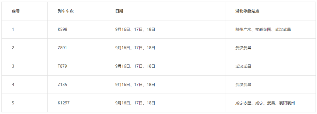 据湖北疾控9月21日消息,因疫情防控需要,请9月16日、17日、18日在以下相应区间站点乘坐过K598(包头-广州)、Z891(广州-郑州)、T879(济南-广州)、Z135(广州-乌鲁木齐)与K1297(广州-银川)的乘客,主动向当地社区报备,服从社区健康管理,如出现不适,请及时就医。