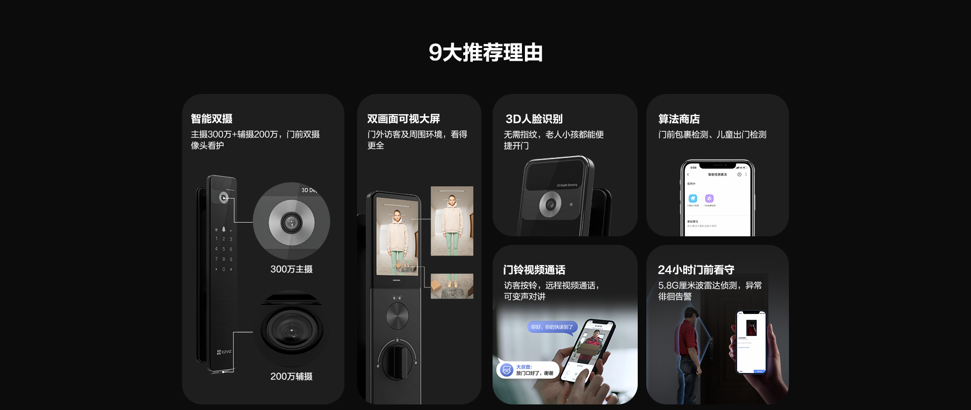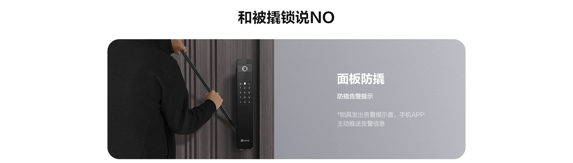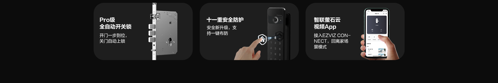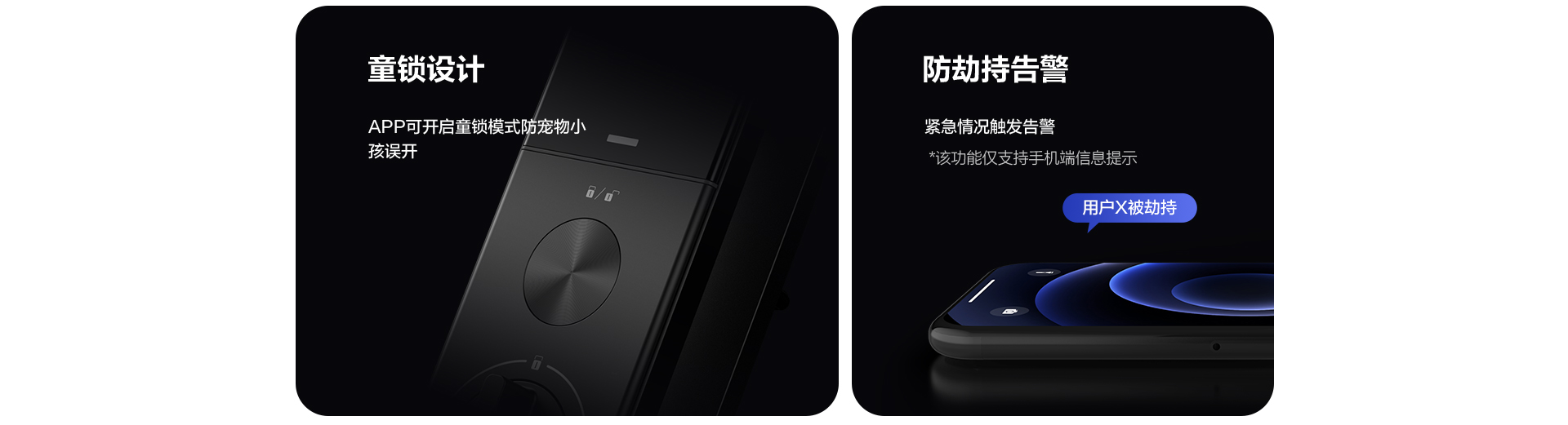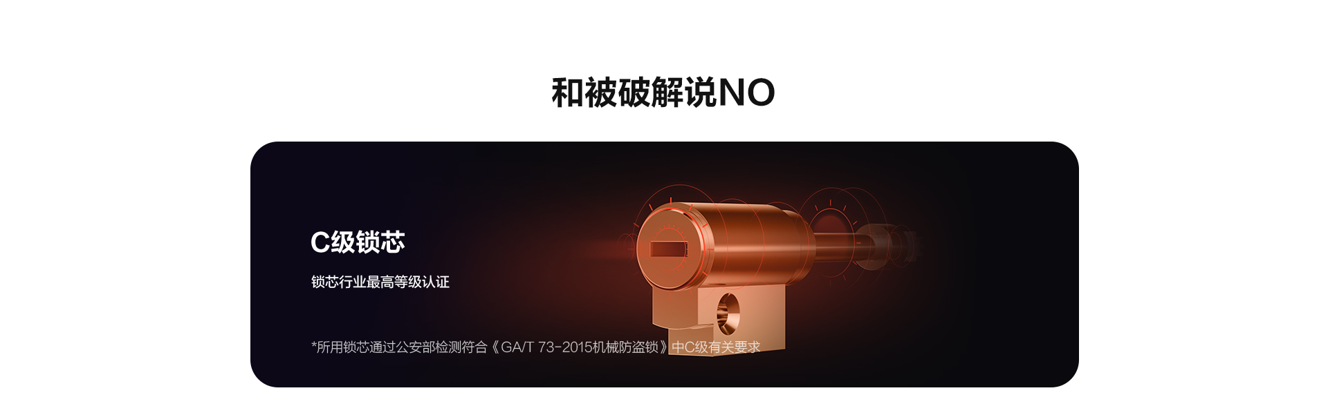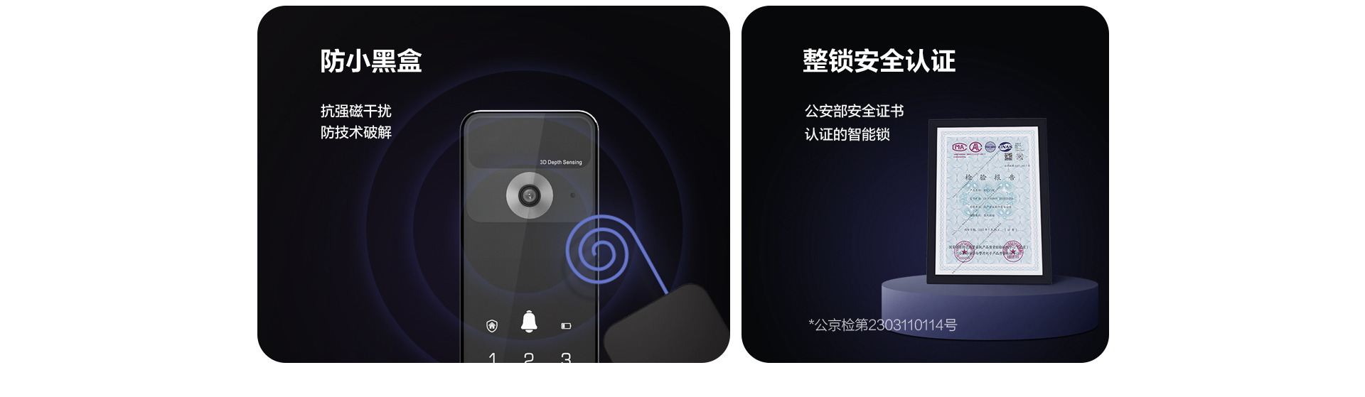 锁具安全防护 离家一键布防,锁体状态全检测,直插式C级锁芯,应急机械开锁,童锁防护,双重验证解锁,虚位密码设计,防小黑盒设计,试错锁定报警,布防模式室内开门报警,门锁被撬报警