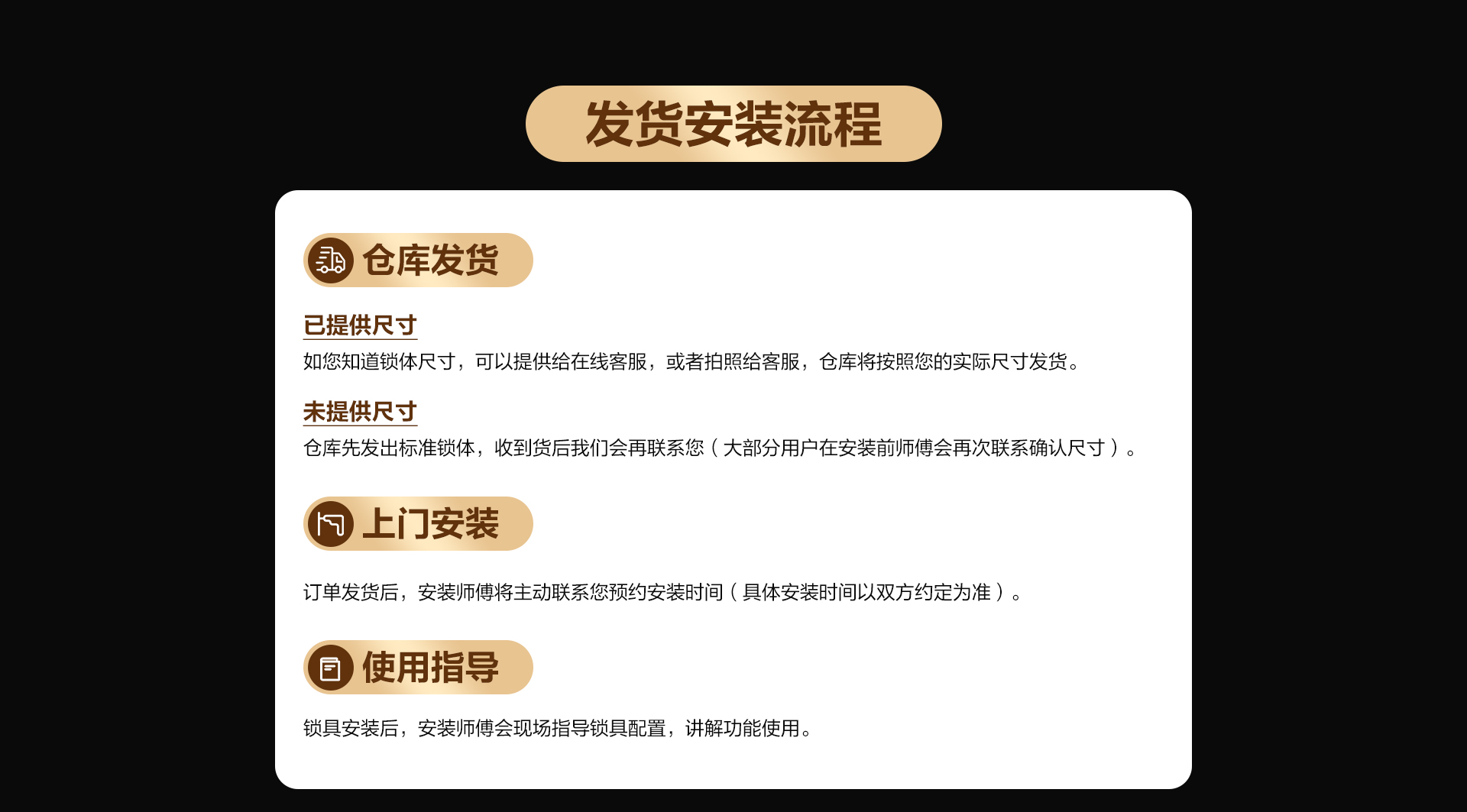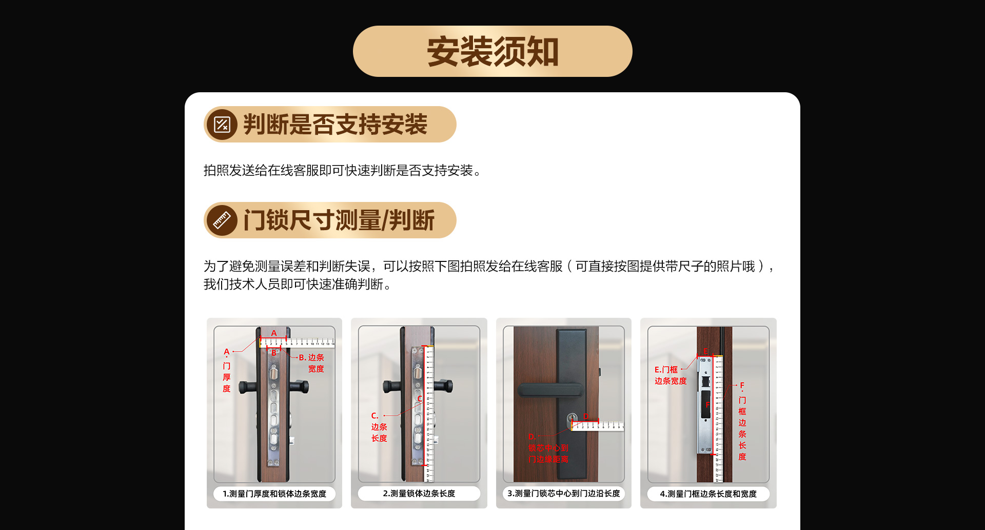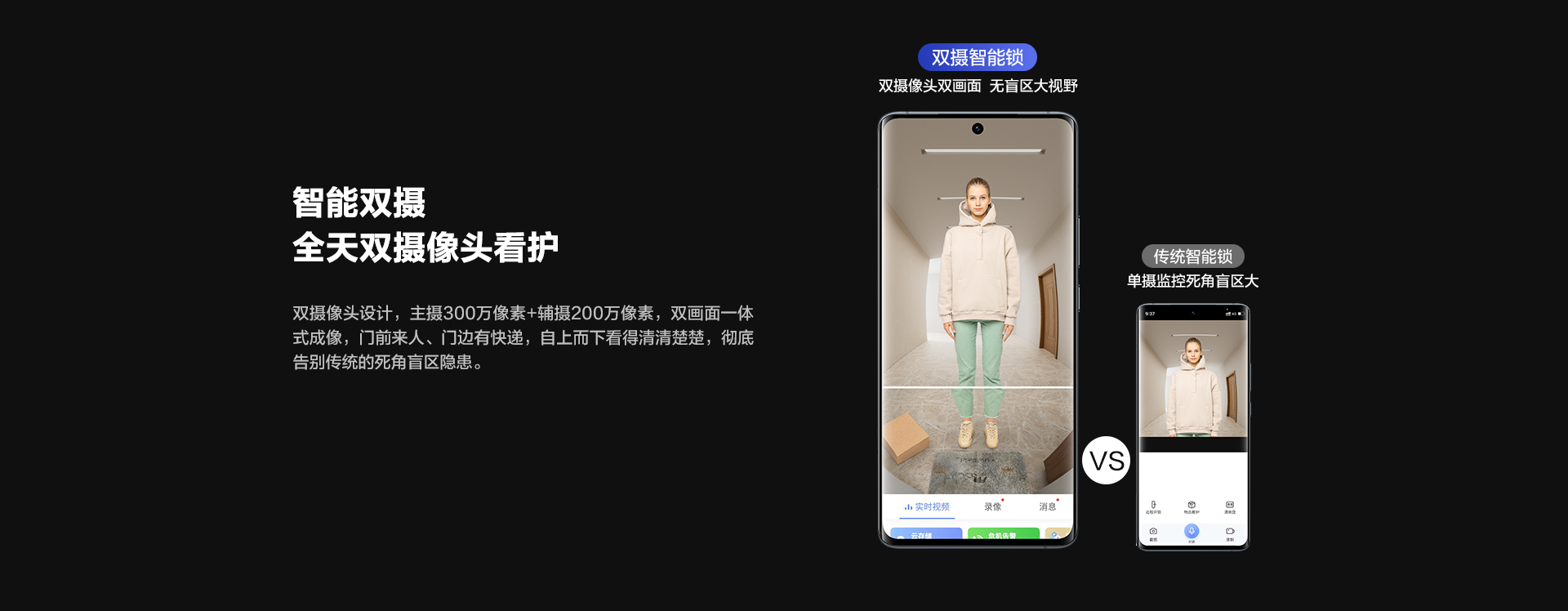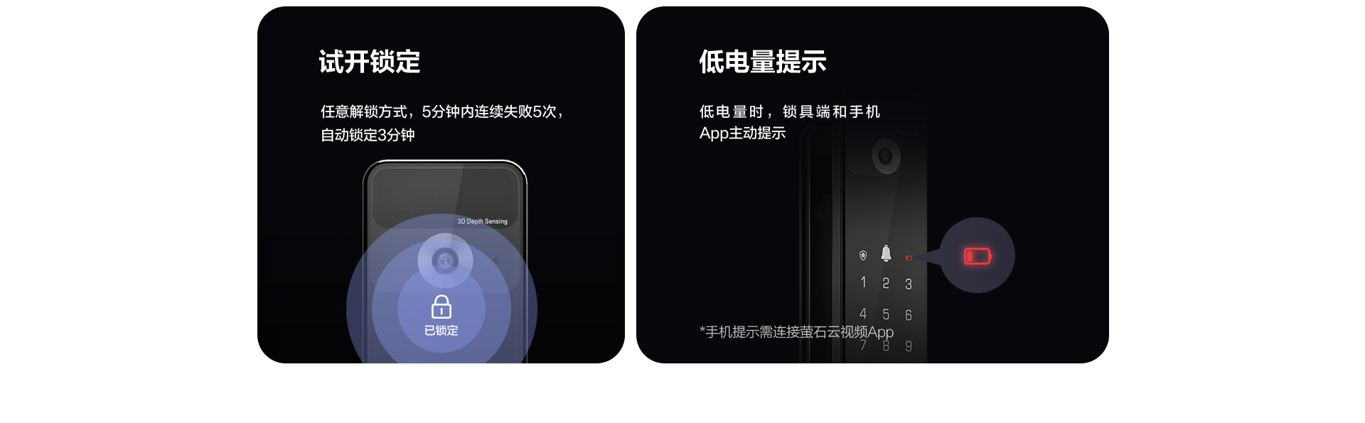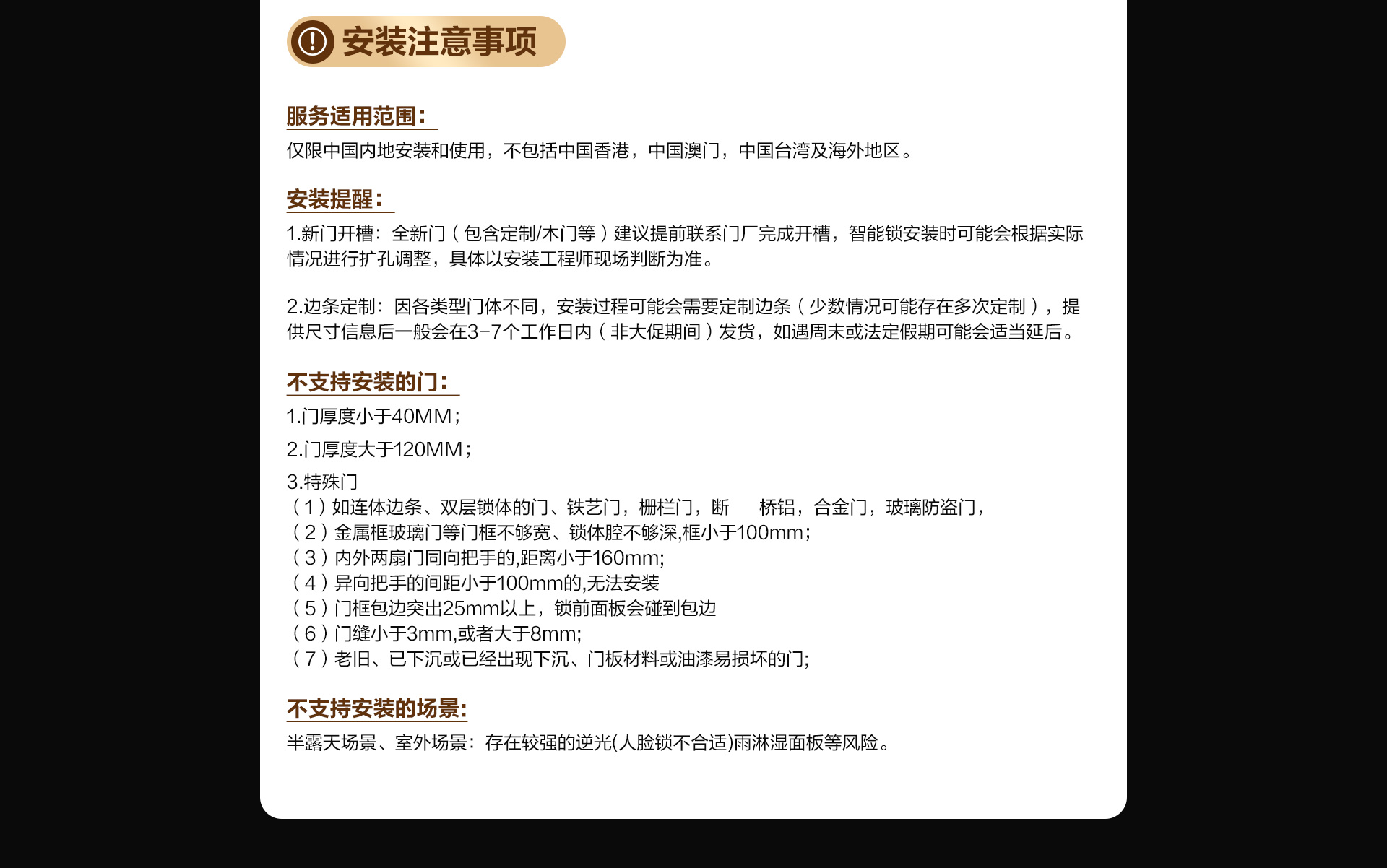 锁具安全防护 离家一键布防,锁体状态全检测,直插式C级锁芯,应急机械开锁,童锁防护,双重验证解锁,虚位密码设计,防小黑盒设计,试错锁定报警,布防模式室内开门报警,门锁被撬报警