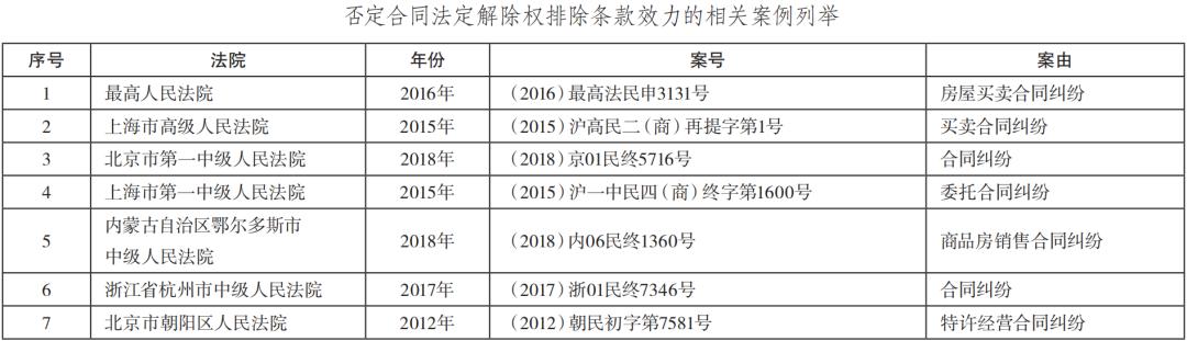 其三,依据约定条款所排除的法定解除权条款并非强制性条款来否定排除条款的效力。在广西北部湾邮轮码头有限公司与浙江金程实业有限公司光船租赁合同纠纷案中,广西壮族自治区高级人民法院就以海商法第一百四十六条属非强制性规定而肯定了排除条款的效力。在王某与北京巴拿米餐饮管理有限公司特许经营合同纠纷案中,北京市朝阳区人民法院则认为《商业特许经营管理条例》规定的被特许人单方解除权属于法定权利,不能通过合同的约定予以排除,以此否定了排除条款的效力。
