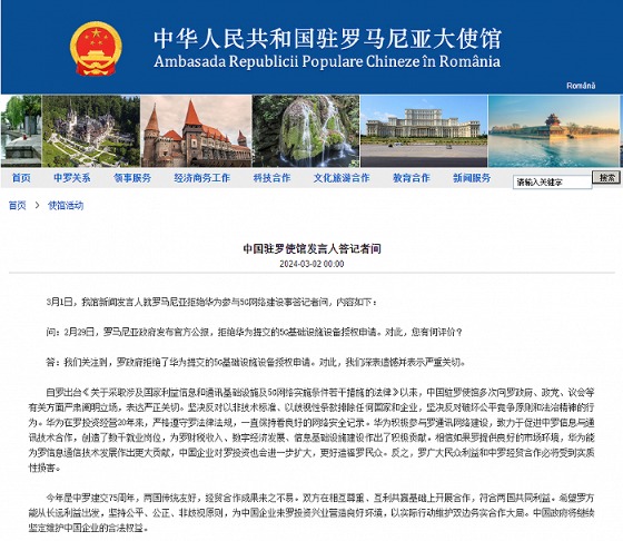 原标题:罗马尼亚拒绝华为参与5G网络建设,中国驻罗使馆:深表遗憾,严重关切