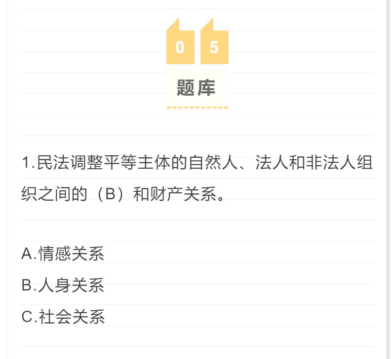 1.民法调整平等主体的自然人、法人和非法人组织之间的(B)和财产关系。