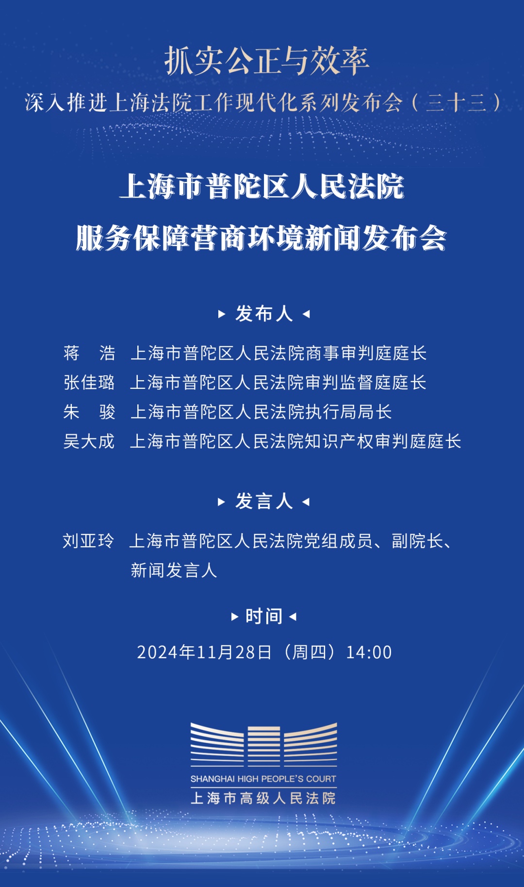 为深入贯彻落实党的二十届三中全会精神,贯彻落实上海市委、上海市高级人民法院和普陀区委关于优化营商环境相关工作要求,今天(11月28日)下午,上海市普陀区人民法院(以下简称普陀区人民法院)召开新闻发布会,发布《2024年上海市普陀区人民法院优化营商环境典型案例》(以下简称典型案例)和《上海市普陀区人民法院坚持和发展新时代知识产权纠纷“枫桥经验”审判白皮书》(以下简称白皮书)。