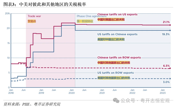 “特朗普1.0”的对华加征关税主要分为三阶段:第一阶段,2017年至2018年初,对美国进口的部分商品加征关税,例如钢铁、铝、洗衣机等,不分国家,但中国是主要进口来源国;第二阶段,2018-2019年,对中国单独加征四轮关税,引发中美贸易摩擦;第三阶段,2020年初,中美达成第一阶段经贸协议,暂停对新一轮商品加征关税,对部分商品加征关税税率减半。