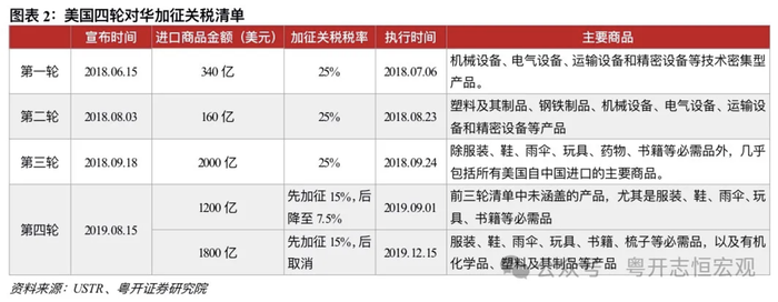 阶段二:美国对华加征“301关税”,中美贸易摩擦正式开始。根据“301”调查结果,2018-2019年,特朗普政府宣布四轮对华加征关税清单,具体内容如下: