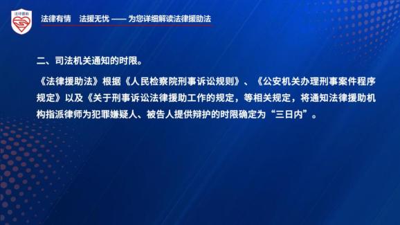 二、司法机关通知的时限。《法律援助法》根据《人民检察院刑事诉讼规则》、《公安机关办理刑事案件程序规定》以及《关于刑事诉讼法律援助工作的规定,等相关规定,将通知法律援助机构指派律师为犯罪嫌疑人、被告人提供辩护的时限确定为“三日内”。