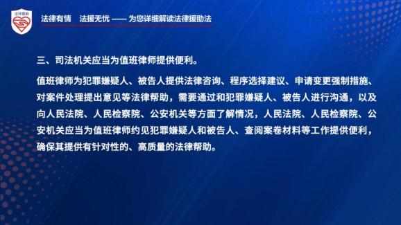 三、司法机关应当为值班律师提供便利。值班律师为犯罪嫌疑人、被告人提供法律咨询、程序选择建议、申请变更强制措施、对案件处理提出意见等法律帮助,需要通过和犯罪嫌疑人、被告人进行沟通,以及向人民法院、人民检察院、公安机关等方面了解情况,人民法院、人民检察院、公安机关应当为值班律师约见犯罪嫌疑人和被告人、查阅案卷材料等工作提供便利,确保其提供有针对性的、高质量的法律帮助。