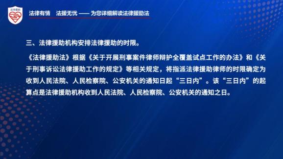 三、法律援助机构安排法律援助的时限。《法律援助法》根据《关于开展刑事案件律师辩护全覆盖试点工作的办法》和《关于刑事诉讼法律援助工作的规定》等相关规定,将指派法律援助律师的时限确定为收到人民法院、人民检察院、公安机关的通知日起“三日内”。该“三日内”的起算点是法律援助机构收到人民法院、人民检察院、公安机关的通知之日。