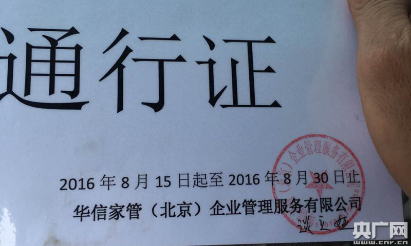 通行证的落款单位为,华信家管(北京)企业管理服务有限公司,法人为:刘亚飞。