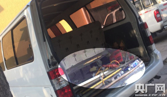 记者在这个院看到三辆五菱宏光、金杯执法车均为无牌车,另一辆金杯后备箱装着的铁棍,锤头,胶棒与劫车时保安员所持物品相吻合,还有一辆遮挡号牌的福田汽车停在院内。一辆正从外边赶来的皮卡,也没有牌照。身旁一个小伙子告诉记者,他只是开车经过十八里店,准备将货物送往丰台区某地,但是被这些保安拦截,感觉莫名其妙。