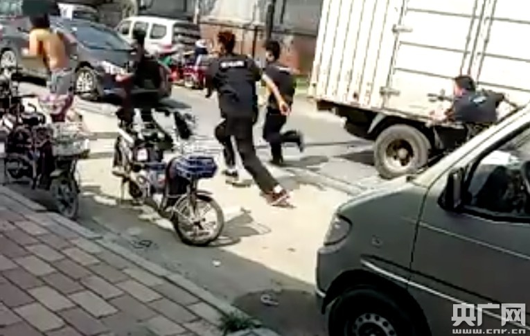 一名金杯车司机被拦下,司机据理力争、拒绝黑衣人扣车,随后一辆无牌面包车闪着警笛开来,下来9名男子,持械将金杯司机围住,其中一人对其推搡。整个过程,没有证件,没有告知,司机见对方人多势众,只得任其连车、带货,开走了。
