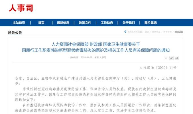 ——《人力资源社会保障部、财政部、国家卫生健康委关于因履行工作职责感染新型冠状病毒肺炎的医护及相关工作人员有关保障问题的通知》(人社部函〔2020〕11号)