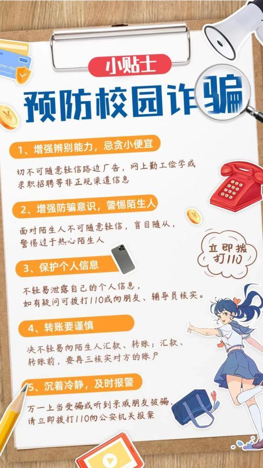 务必妥善保管好自己的身份证、手机卡、银行卡等,一旦丢失请及时挂失,不论何种情况,切勿贪图小利。一定保持清醒头脑,明辨是非不为所动,千万不要以身试法。要树立正确的消费观和金钱观,增强自我保护意识。