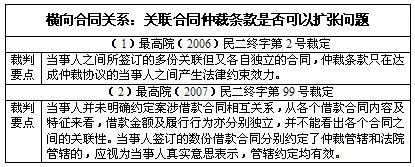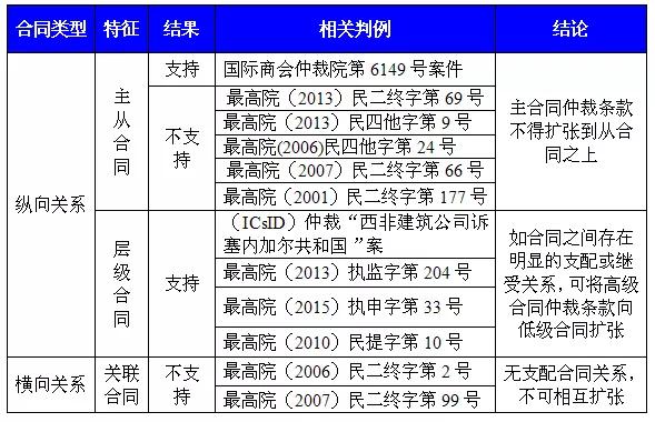 通过对上述裁判的总结可以发现,实务中在处理仲裁约定可否应用于未约定的相关合同的问题时,可分成如下几种观点:第一,担保类主从合同关系中,主合同仲裁条款不得扩张到从合同之上;第二,如合同之间存在明显的支配关系,一般可以将上级合同仲裁条款扩张到低级别合同中;第三,如合同之间存在继受关系,一般可以将原合同仲裁条款扩张到补充合同中;第四,在合同间无支配或继受关系时,即便这些合同联系再密切也不可相互扩张。