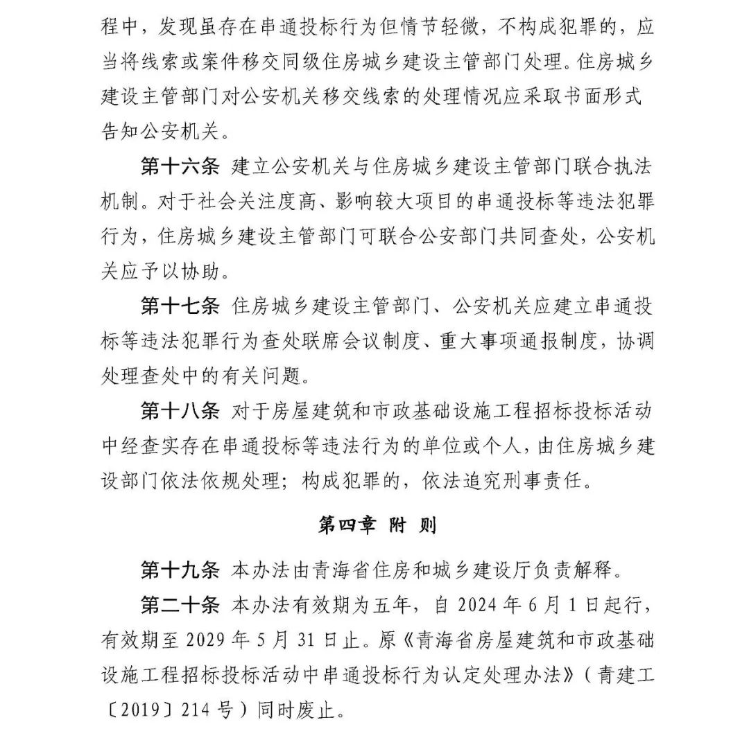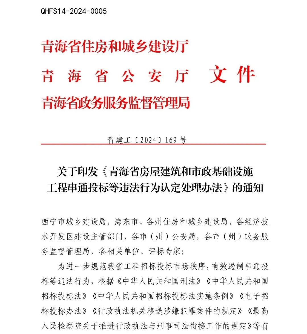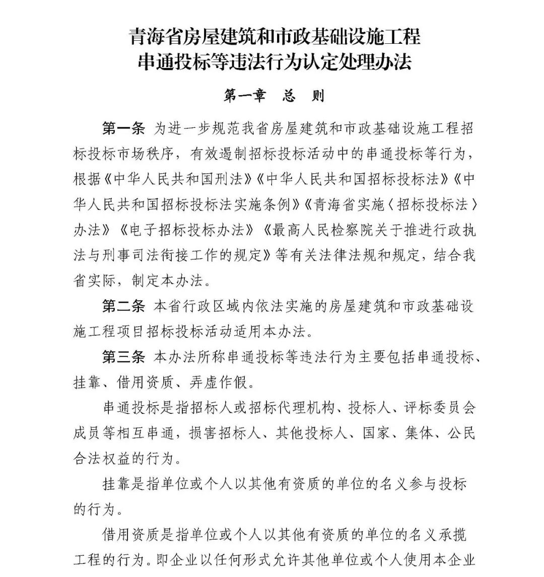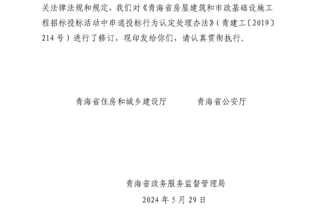 青海省住房和城乡建设厅、青海省公安厅和青海省政务服务监督管理局近日联合印发《青海省房屋建筑和市政基础设施工程串通投标等违法行为认定处理办法》,明确了37中串通投标的具体行为。