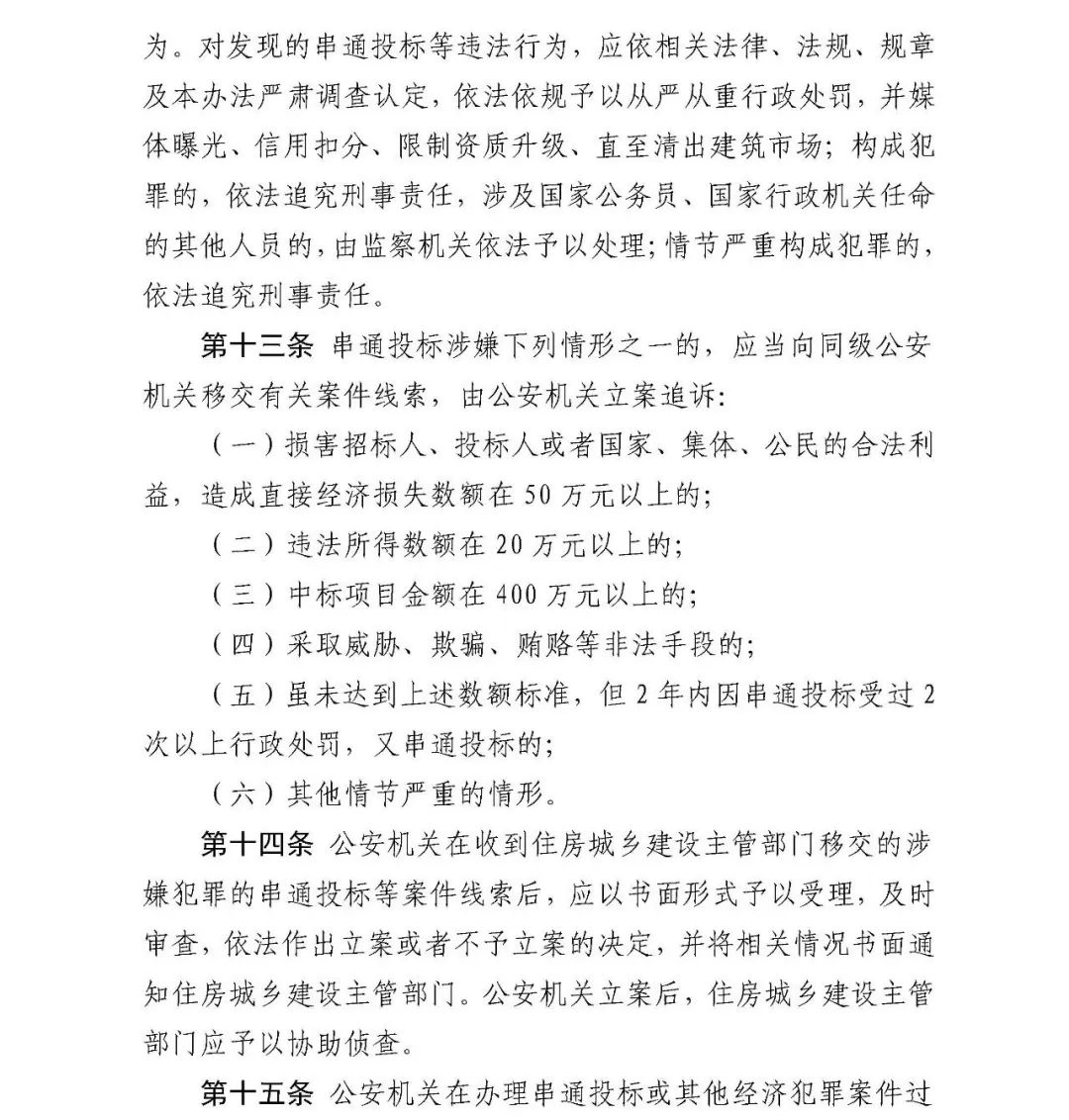 串通投标涉嫌6种情形之一的,应当向同级公安机关移交有关案件线索,由公安机关立案追诉: