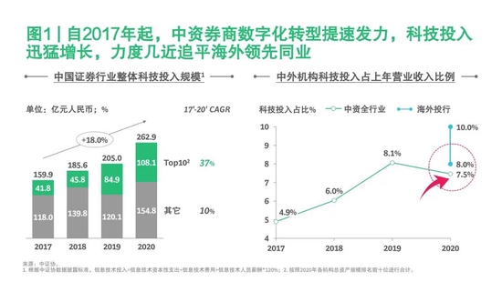 近年来中资券商数字化投入幅度整体显著提升,部分中资券商追平外资领先机构的投入力度。自2017年以来,国内各券商纷纷加大数字化转型投入力度,全行业信息科技投入1规模以18%的增速持续增长,至2020年已突破260亿元,营业收入占比从上年的4.9%提升至7.5%。