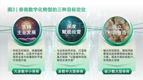 结合行业与领先实践,我们认为券商开展数字化转型通常可采用三种目标定位:支持主业发展、深度赋能经营、独立利润创造。